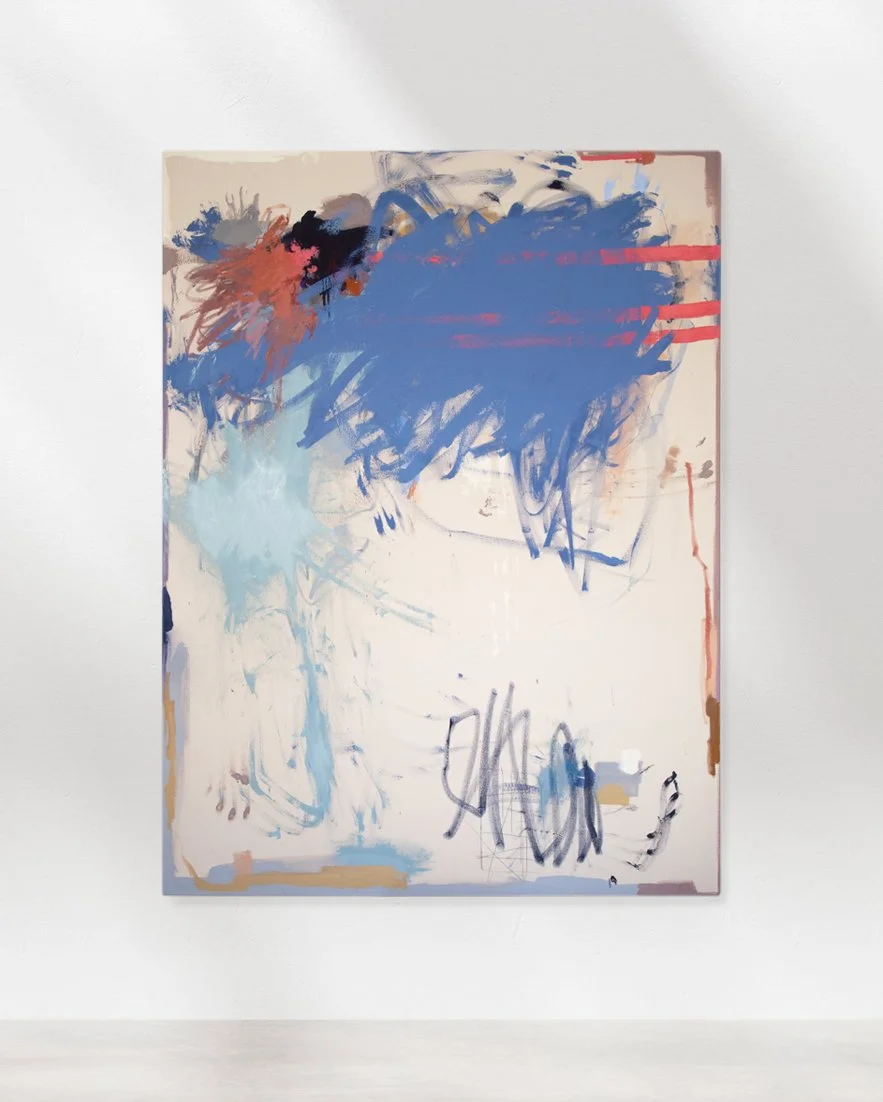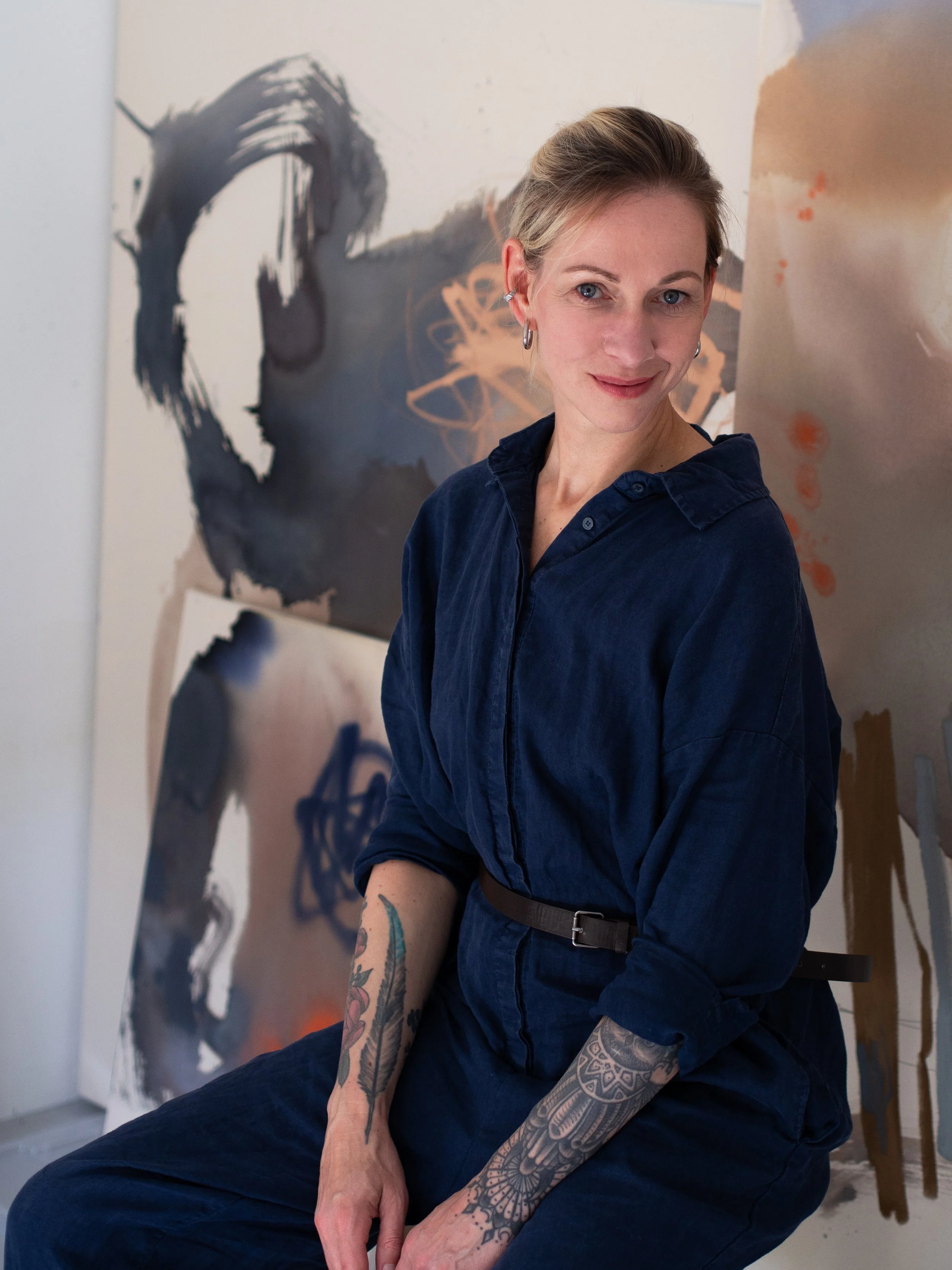 Her abstract paintings explore the dialogue between chance and control, gesture and reduction.
